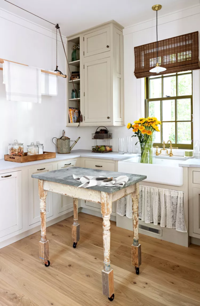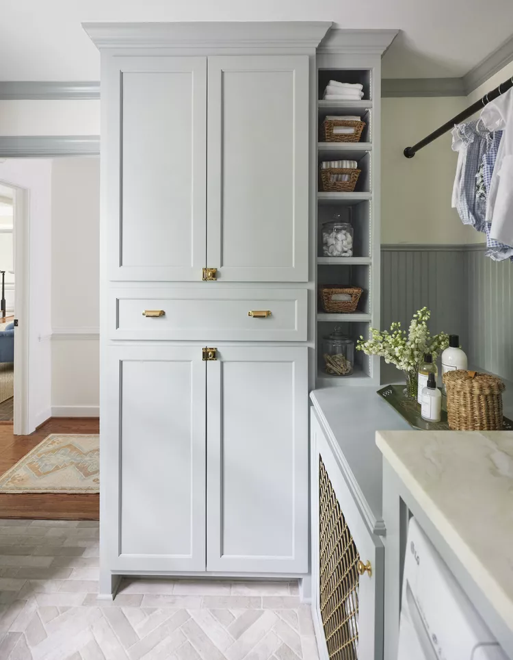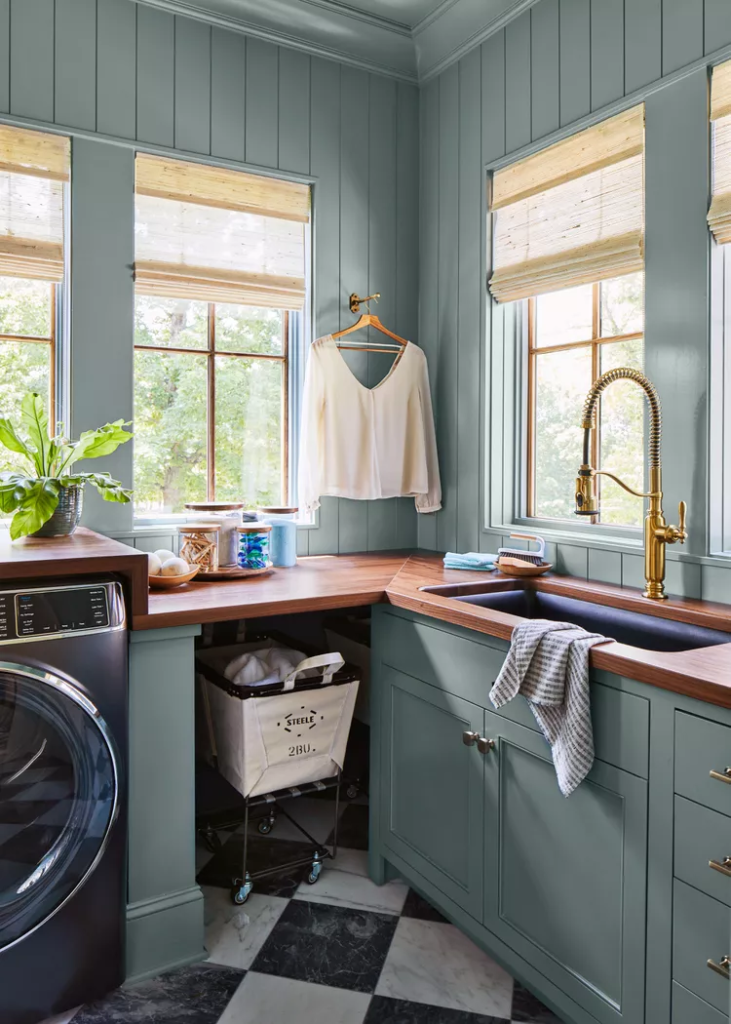 Na nossa Casa de Ideias de 2023 na região de Leiper’s Fork, Tennessee, a designer Laura Hodges adotou uma abordagem cuidadosa para o espaço trabalhador, equipando-o com belos detalhes, como bancadas de madeira personalizadas fabricadas pela Grothouse, acessórios de latão, persianas entrelaçadas e uma camada de tinta Sherwin-Williams’ Portsmouth (SW 9644) nas paredes e armários.