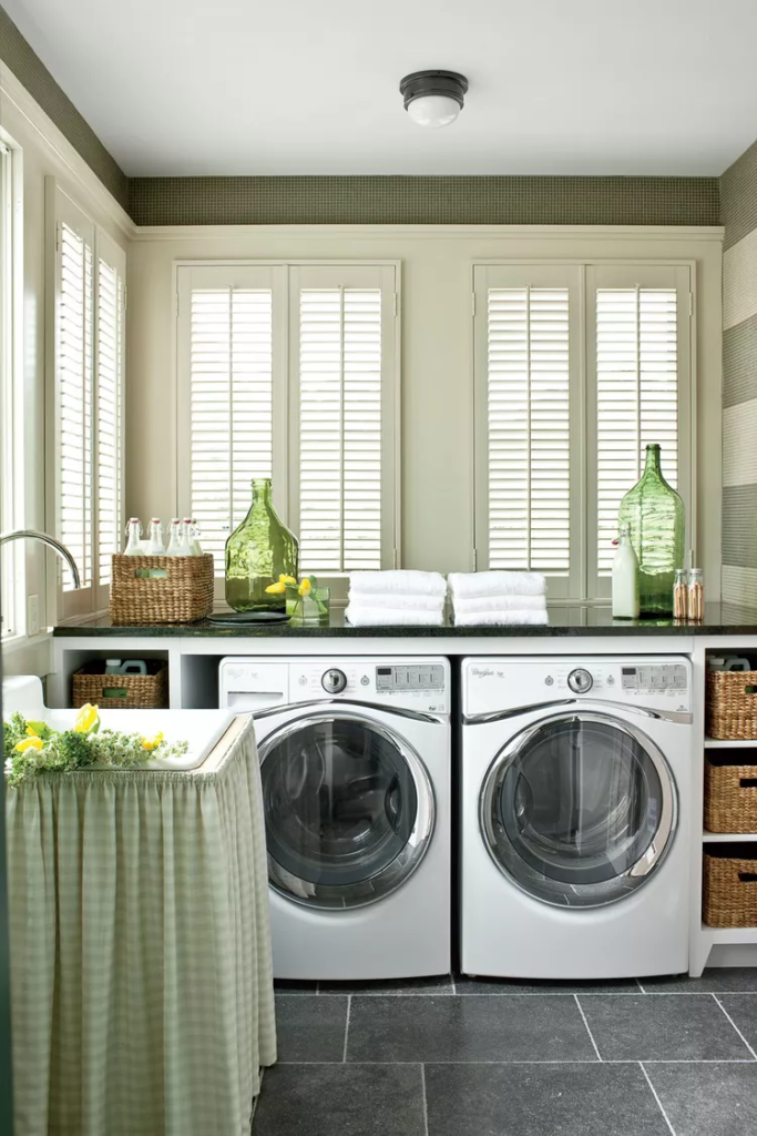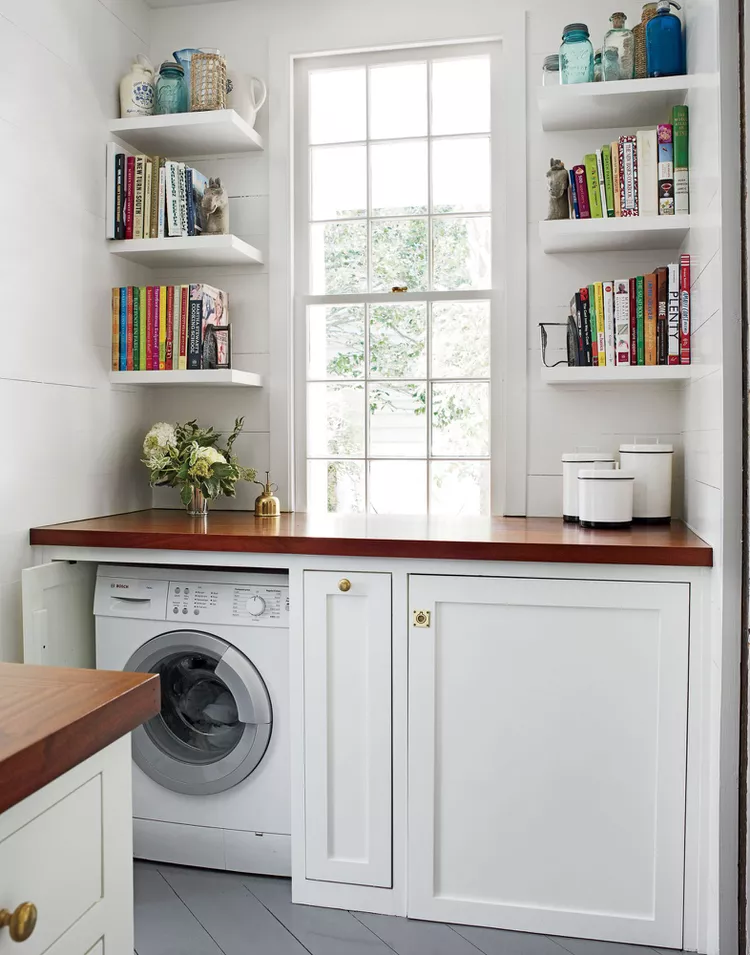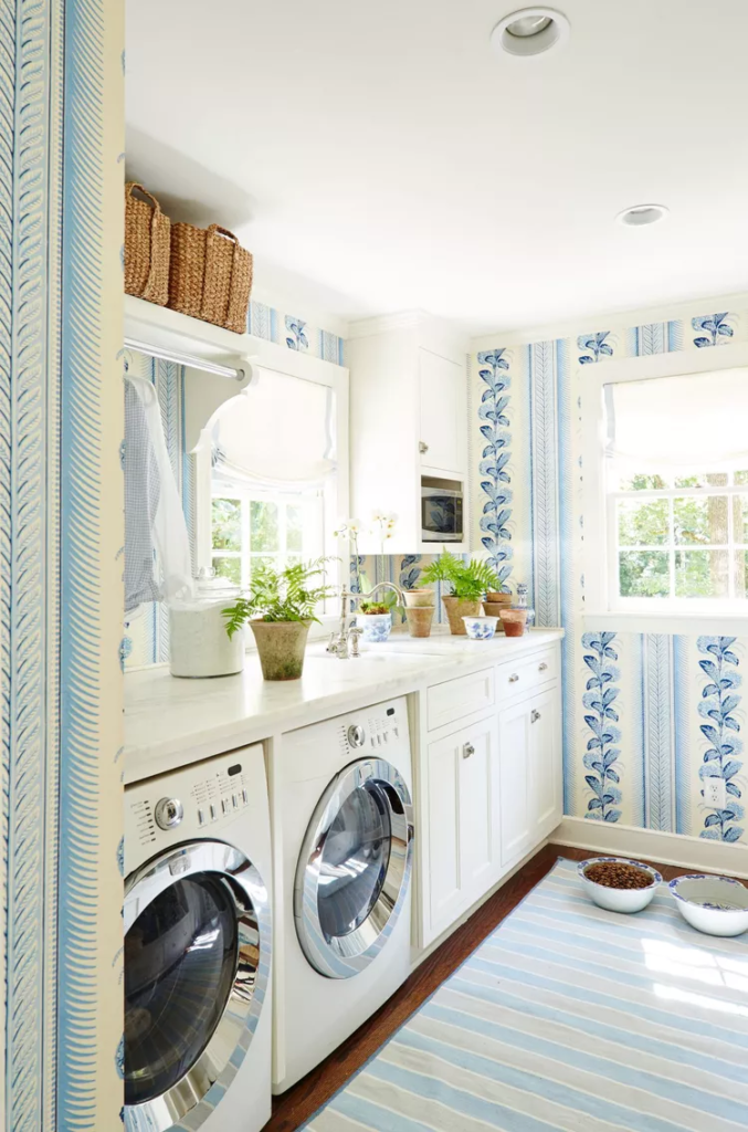 Se você vai passar bastante tempo na lavanderia, por que não decorar o espaço de acordo com o seu gosto? Na sua casa em Nashville, Sarah Bartholomew revestiu as paredes com o papel de parede Climbing Hydrangea da Quadrille, e ela mantém plantas no ambiente. Acima da lavadora e secadora, há espaço suficiente para dobrar roupas ou cultivar suas habilidades de jardinagem.