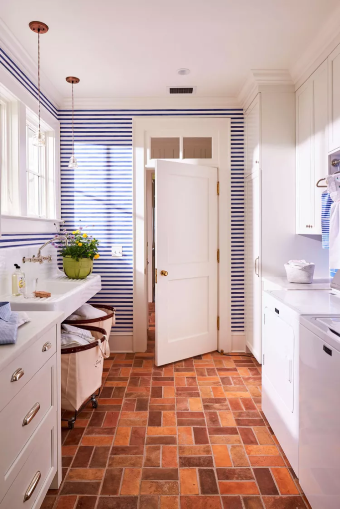 Quem disse que a lavanderia precisa ser sem graça? Para evitar que este espaço pareça frio, a designer Stephanie Jarvis pendurou papel de parede listrado que parece ter sido pintado à mão. Tijolos finos de argila em um padrão tradicional de espinha de peixe fazem com que o piso pareça um antigo chão de tijolos do sul.