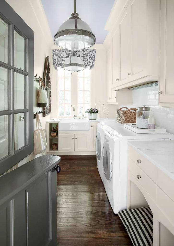 Nesta casa em Atlanta, a designer Suzanne Kasler criou um espaço embutido para uma cama confortável para o cachorro. Uma pia espaçosa e espaço de balcão de qualidade deixam muito espaço para dobrar roupas e outras tarefas. A pintura lilás de alto brilho adiciona interesse ao teto e atrai os olhos para cima.