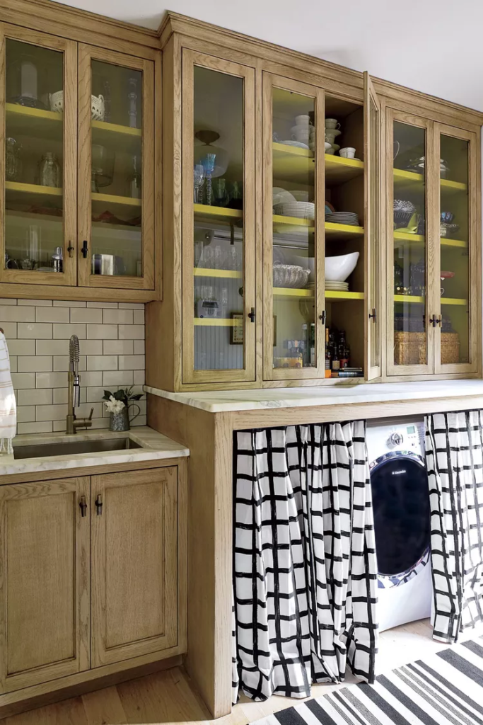 A designer Fran Keenan precisava de uma área multiuso: parte lavanderia, parte vestiário e parte bar. A solução? Ela adicionou uma parede de armários no corredor lateral perto da cozinha. Nesse pequeno espaço, ela escondeu uma lavadora e secadora por trás de saias feitas de tecido da Ikea, montou um bar nos armários superiores e colocou uma pia de preparo ao lado.