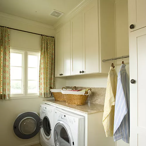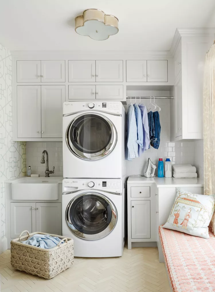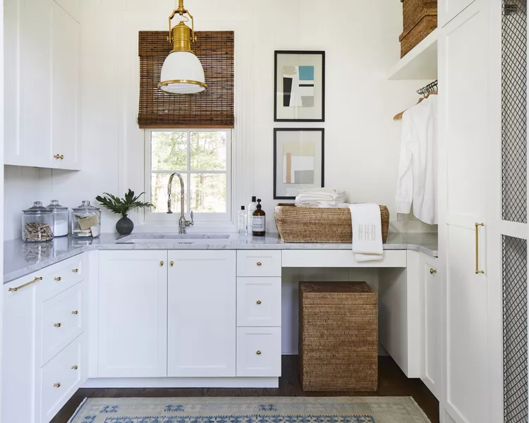 Em uma lavanderia apertada, pode não haver espaço para muitos enfeites. Como tal, os designers têm que aproveitar qualquer espaço pequeno com o qual possam trabalhar. Escolha detalhes e acessórios que priorizem tanto a beleza quanto a função, para que você não precise sacrificar um pelo outro.