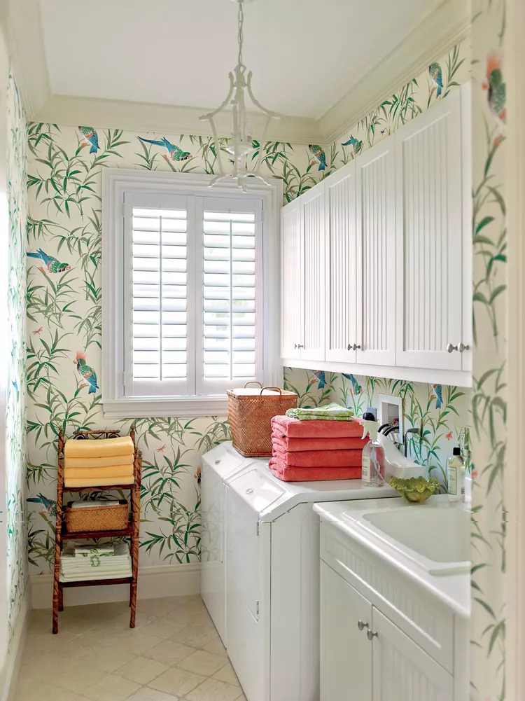 A designer Ashley Whittaker não teve medo de brincar com estampas e papéis de parede divertidos nesta lavanderia. ‘Você passa muito tempo lá dentro, então por que não deixá-lo bonito e divertido?’ diz Whittaker. O papel de parede estampado tropical (Bamboo & Birds Beige da Bob Collins and Sons) tem um revestimento de vinil brilhante para protegê-lo da umidade e danos causados pela água.