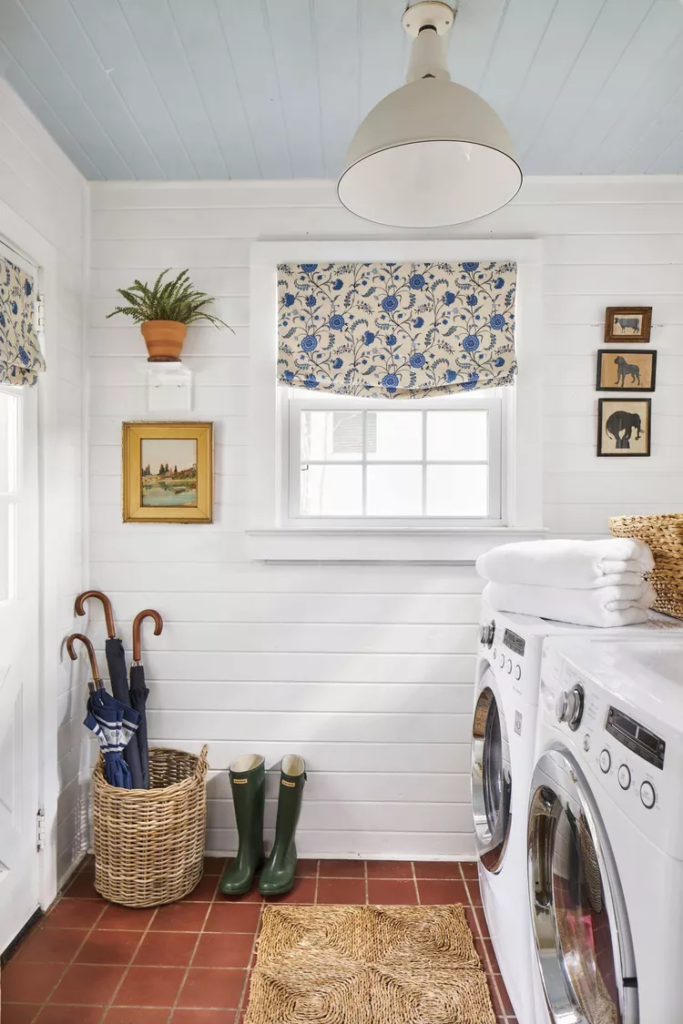 Este cômodo de lavanderia desempenha dupla função como um vestiário. A decoradora Whitney McGregor manteve os pisos originais de terracota neste espaço de lavanderia convertido de uma varanda fechada e pintou o teto de azul, tornando a atmosfera do cômodo clara e arejada sem comprometer a praticidade. Estampas vintage, uma planta doméstica descontraída e persianas divertidas garantem que esta lavanderia seja alta em funcionalidade e design.