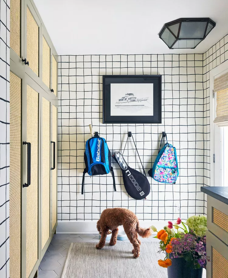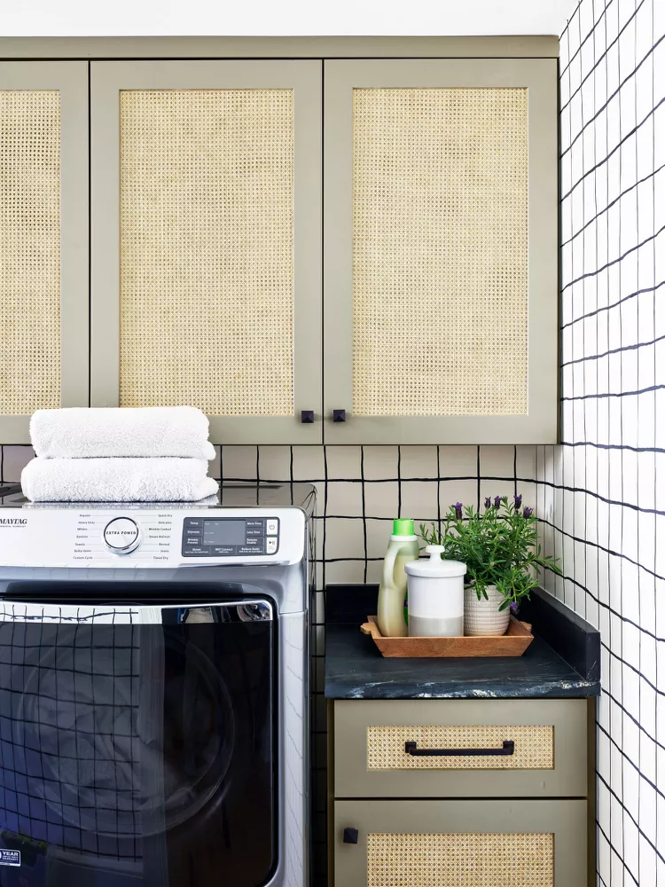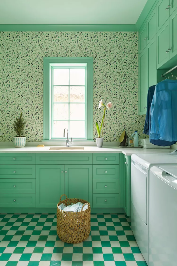 Esta lavanderia evoca uma reação nostálgica devido aos pisos quadriculados e aos armários verde-menta. O papel de parede acrescenta charme, mas com um padrão botânico atualizado. Toques finais simples, como flores e cestos de vime, reforçam a singeleza desta lavanderia.
