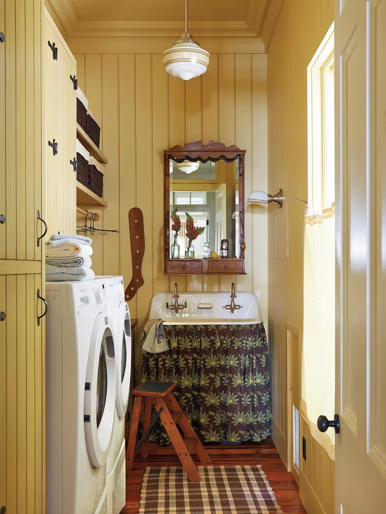 Comece suas tarefas de lavanderia de bom humor ao entrar em um cômodo pintado de amarelo-sol. O amarelo pode não ser uma escolha óbvia para as paredes, mas em uma lavanderia, há espaço para experimentar com cores ousadas e encantadoras. Este espaço, combinado com armários de madeira em tons quentes, tem um charme rústico que faz você sorrir ao ver.