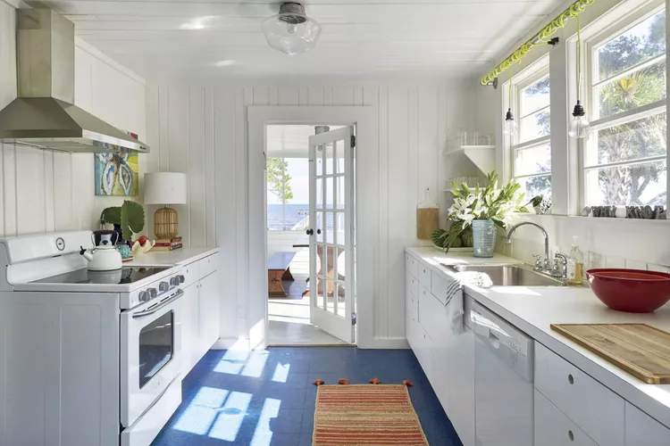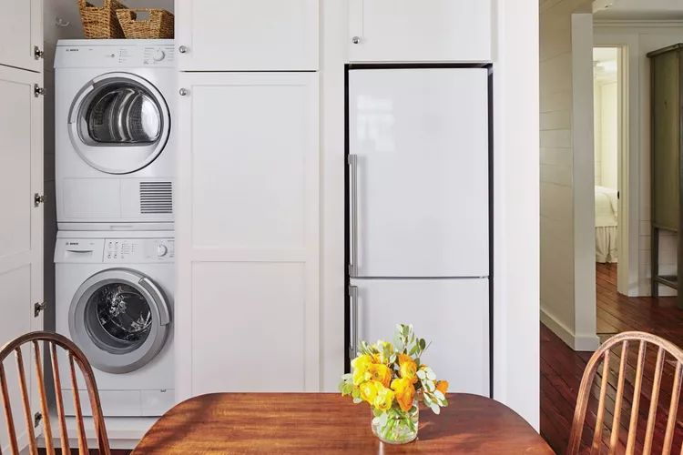 Neste chalé de 56 metros quadrados, cada centímetro importa. Para economizar espaço precioso, a máquina de lavar e a secadora são empilhadas e escondidas na cozinha, paralelas à geladeira. Para fazer tudo funcionar, os designers usaram dois armários padrão para esconder as máquinas e instalaram tomadas elétricas através da despensa.