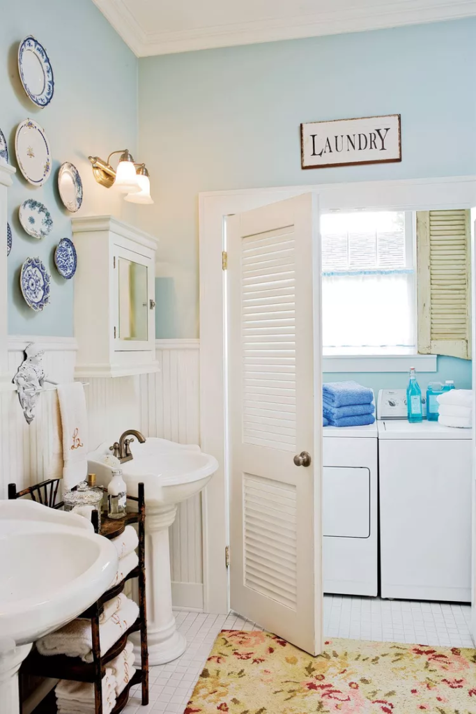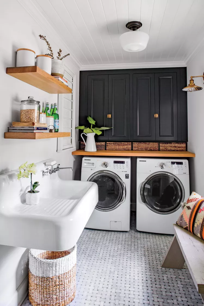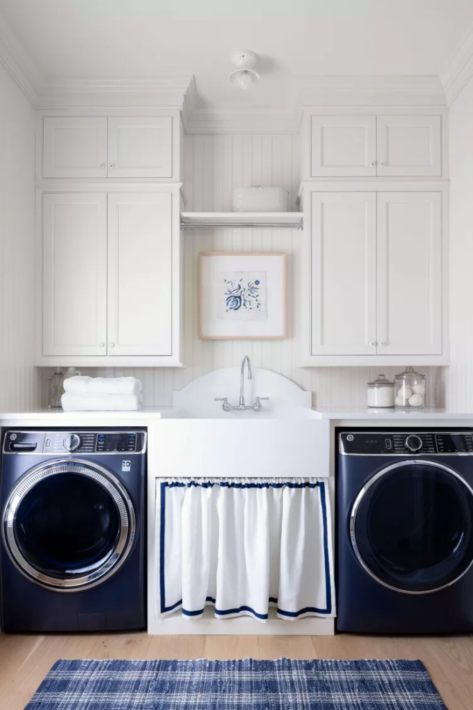 Todos sabemos como os sulistas se sentem em relação à clássica combinação de cores azul e branco. Divirta-se ao escolher seus eletrodomésticos e use-os como um destaque em sua lavanderia. Na nossa Casa de Ideias de 2021, a designer Sarah Bartholomew escolheu uma pia grande com espaço de armazenamento oculto para ajudar a enxaguar rapidamente as bagunças de brincadeiras ao ar livre antes de lavar.