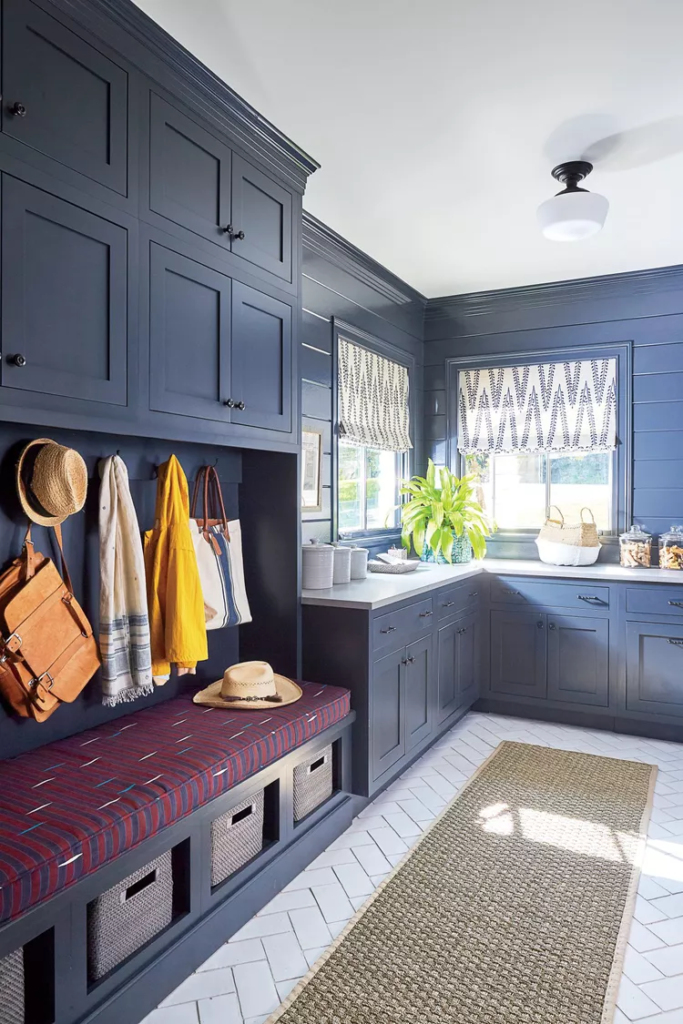 O Slate Teal (2058-20) da Benjamin Moore atrai você para o pequeno espaço nesta lavanderia no estilo Lowcountry. Armários personalizados na mesma tonalidade dramática adicionam espaço extra para armazenamento variado. Uma janela é sempre bem-vinda, pois permite que a luz natural ilumine esta tarefa temida.