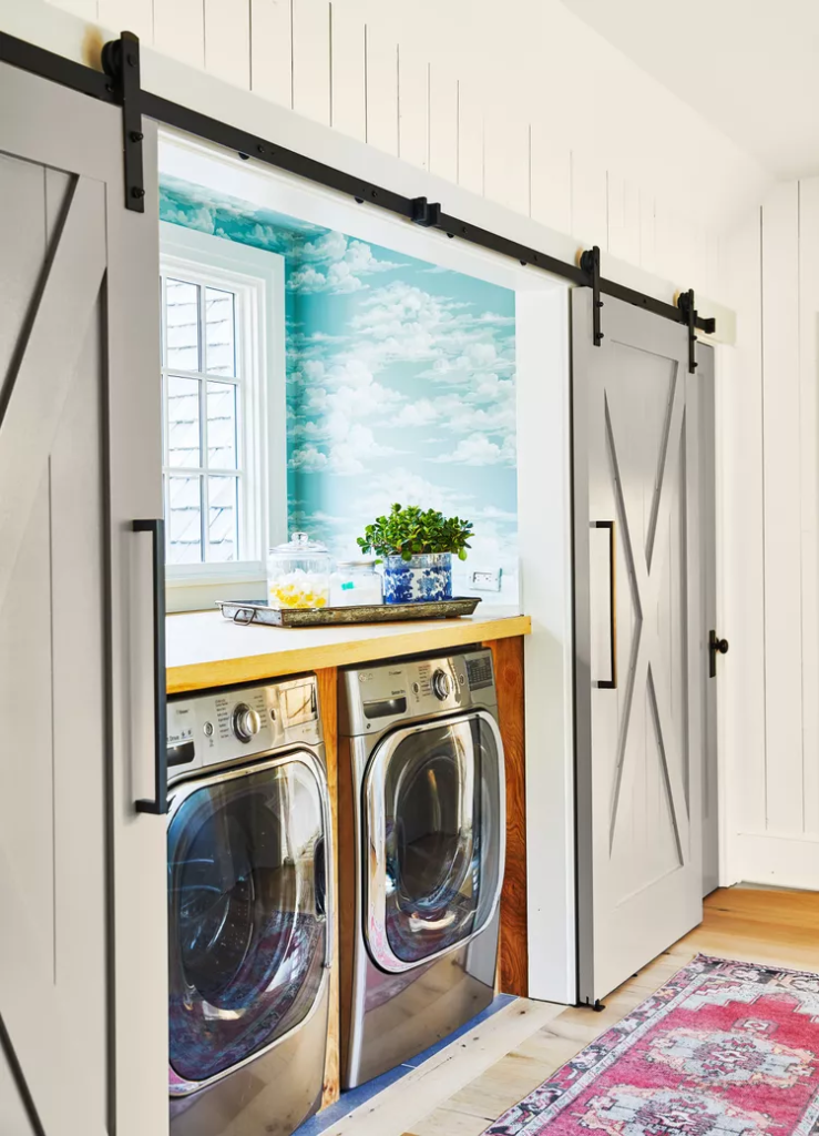 Cada casa tem necessidades diferentes e muitas são organizadas de forma diferente. Por exemplo, alguns proprietários acham que suas máquinas de lavar roupas se encaixam logo ao lado da cozinha ou em outra área de alta circulação da casa. Se a sua área de lavanderia é menos um cômodo e mais um recanto conveniente, esconda-a. Nesse caso, portas de celeiro podem esconder a máquina volumosa em um instante e também servir como decoração super moderna no estilo Modern Farmhouse.