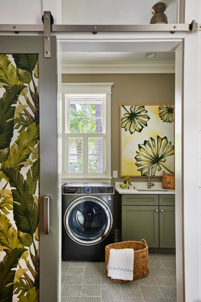 Aconchegante e bonita, esta lavanderia tem tudo. Pintados de verde, os armários são o auge do estilo, com obras de arte animadas para combinar. Acolhedora de mais de uma maneira, esta lavanderia também é projetada com adaptabilidade em mente, assim como toda a casa.