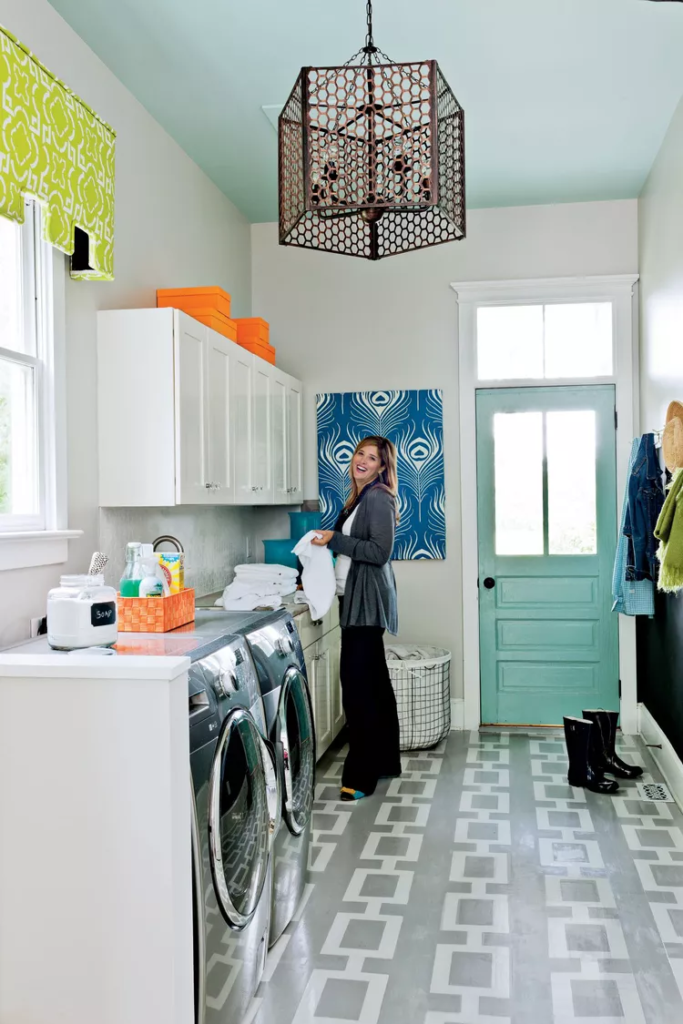 Não pare de adicionar interesse à sua lavanderia apenas nas paredes — o teto e os pisos também estão abertos para mudanças. Pintar os pisos é uma excelente maneira de adicionar interesse e renovar um espaço sem construção. Decore o piso da lavanderia com um padrão de tabuleiro de xadrez, pseudo-tiles, ou qualquer padrão que você deseje.
