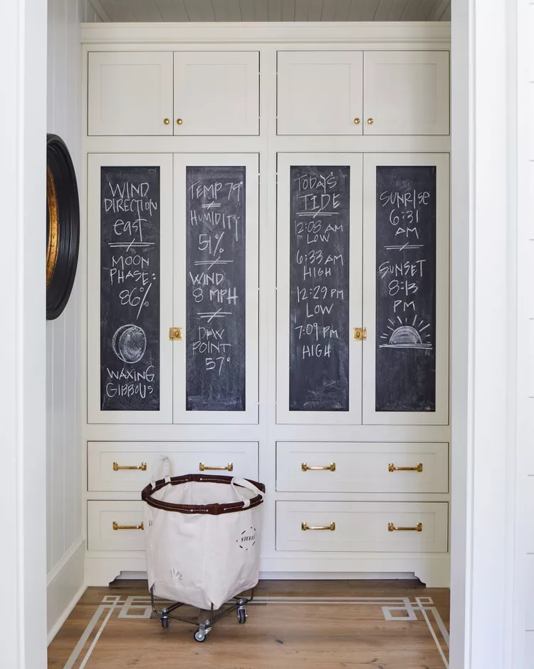 Projete uma lavanderia que atenda às suas necessidades e gostos, mas também uma que crescerá com você e sua família. Isso significa não cair em armadilhas de microtendências que sairão de moda. Uma maneira de garantir que seu espaço mudará com o tempo é incluir elementos que possam literalmente fazê-lo. A tinta de lousa permite que essas portas de armário sejam alteradas a qualquer momento.