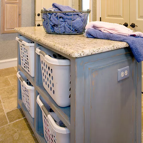 Com muita roupa para lavar vem a necessidade de muito espaço de armazenamento. Especialmente com uma família grande e bagunceira, os proprietários podem se ver precisando de mais oportunidades de armazenamento para manter suas lavanderias em ordem. Se o espaço permitir, uma ilha oca com prateleiras para organização fácil abre um mundo de possibilidades de armazenamento, bem como espaço de balcão extra.