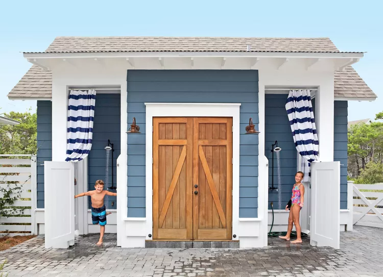 Fora, esta casa de praia em Watersound, na Flórida, encanta com chuveiros ao ar livre, escondendo uma lavanderia por dentro. É perfeito para lavar roupas de banho e toalhas cheias de areia.