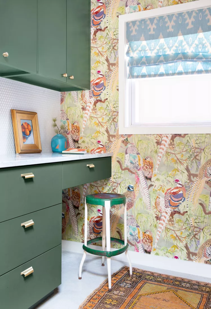 No canto desta incansável lavanderia, um pequeno espaço de trabalho adiciona ainda mais funcionalidade ao espaço para que o proprietário possa escapar para lá para qualquer tarefa necessária. Felizmente, este espaço não é só trabalho e nada de diversão. Papel de parede vibrante em um padrão brincalhão, juntamente com gavetas pintadas de verde e decoração brilhante, resultam em uma lavanderia animada.