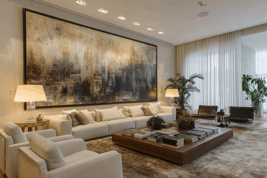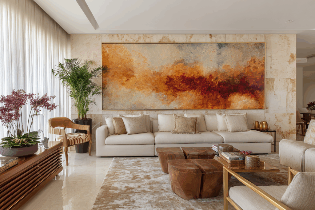 Um exemplo clássico de combinação perfeita é a utilização de um quadro grande em uma sala de estar ampla. O quadro, que ocupa uma parte significativa da parede, se torna o ponto focal do espaço, criando um contraste interessante com a mobília e com as cores ao redor. Quando o quadro é proporcional ao espaço, ele se torna uma extensão natural da decoração e contribui para a harmonia geral do ambiente. Antes de comprar um quadro, descubra o que ninguém te conta sobre proporção e como ajustar a obra para maximizar seu impacto visual.