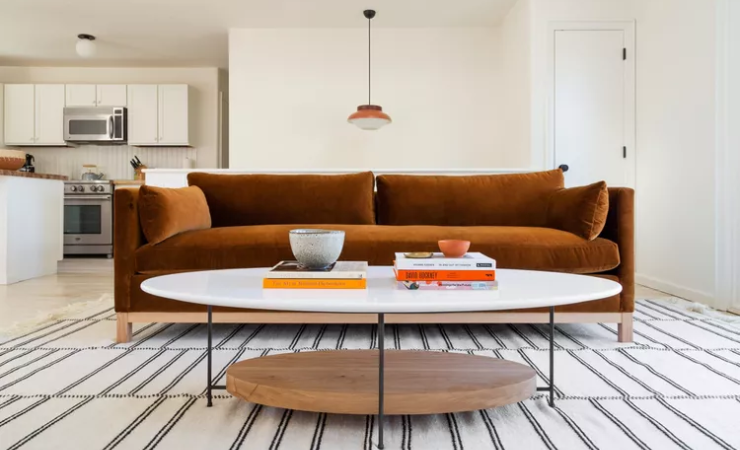 Você também deve considerar a cor e o material do tecido do sofá. “Use esses elementos como ponto de partida para decidir por onde ir a seguir!” Gage diz. Também é útil, observa Haywood, determinar quais varejistas você se sente atraído – algo que provavelmente descobrirá desde cedo, especialmente ao comprar itens de alto valor.