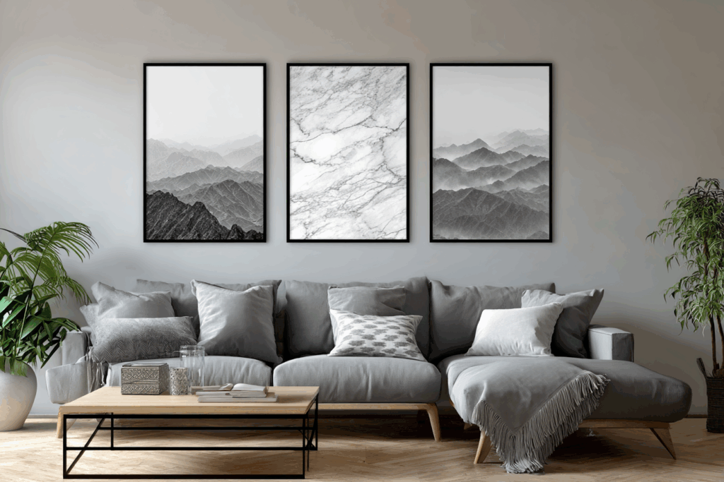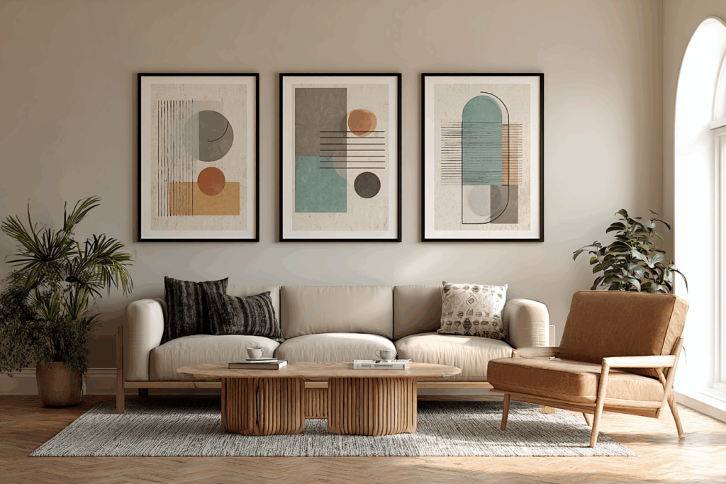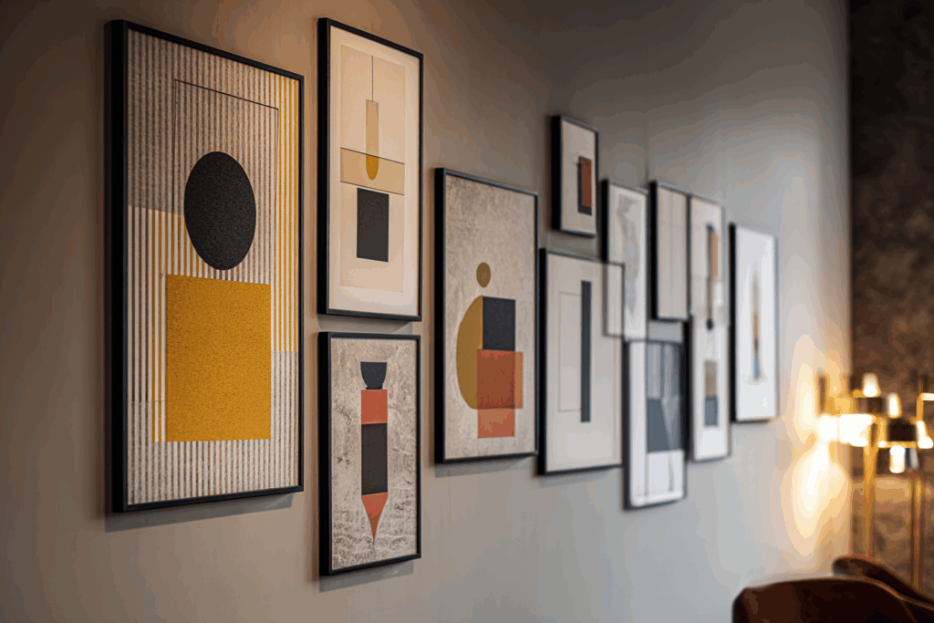 Usar a linha-guia é ideal para quem busca uma composição limpa e bem estruturada. Essa técnica de composição com quadros muda tudo na decoração ao garantir que a arte não sobreponha o ambiente, mas se integre de forma natural. Ao aplicar essa técnica, os quadros se tornam elementos complementares, não competitivos. O resultado é um design visualmente agradável.
