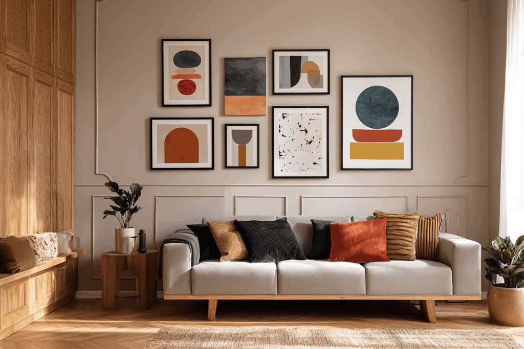 Ela transforma a decoração ao criar um espaço visualmente interessante, equilibrado e sofisticado, utilizando posicionamento estratégico dos quadros.