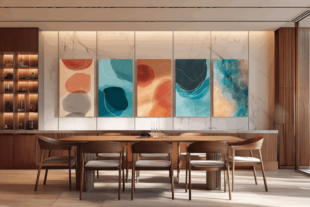 Espaçar os quadros de forma precisa também facilita a visualização de cada peça. Essa técnica de composição com quadros muda tudo na decoração, permitindo que cada quadro se destaque sem competir com os outros. O espaçamento certo ajuda a criar um impacto visual sem sobrecarregar a parede. O resultado é um design mais refinado e coerente.