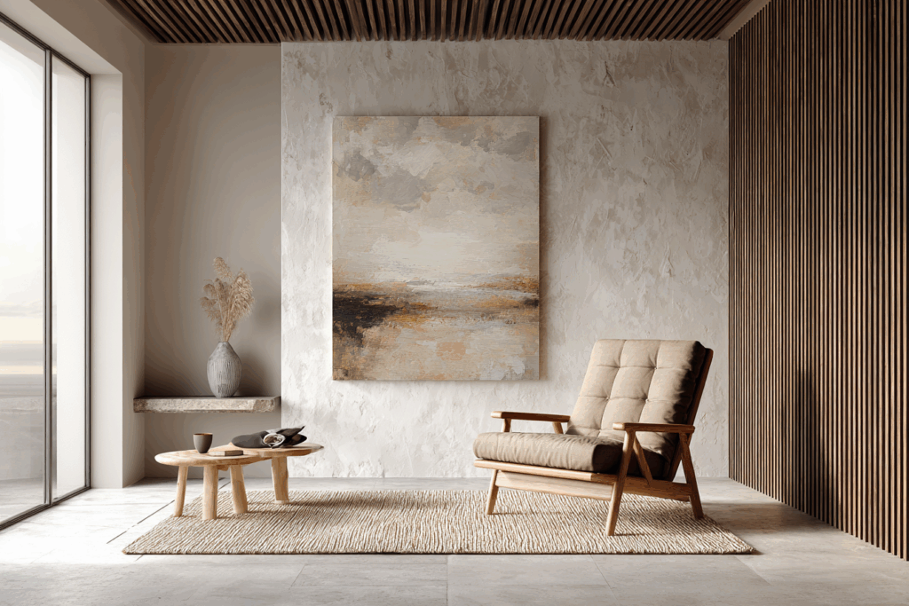 Tons neutros, terrosos, dourados e metálicos são excelentes opções. Eles evocam requinte e elegância atemporal. Com essa paleta, o quadro certo pode dobrar o valor visual da sua sala — veja como, elevando a estética e a atmosfera do espaço.