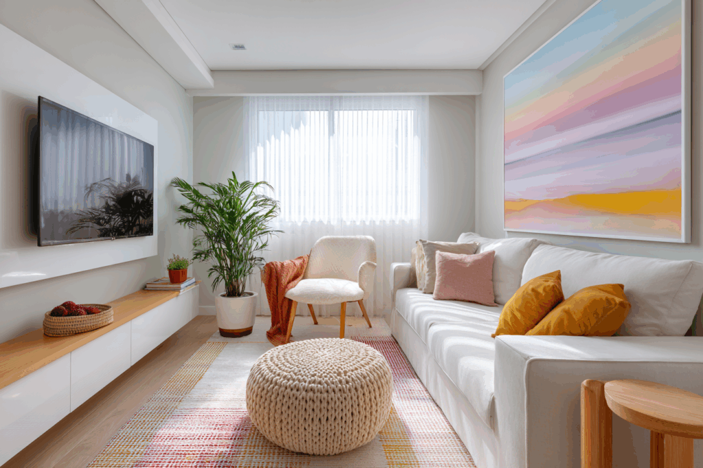Quando desejar destaque, use um único acento cromático pequeno dentro de um campo claro. Assim, você sustenta o tipo de quadro que faz sua sala parecer mais ampla e iluminada e ainda garante personalidade. O ponto de cor guia o olhar. O restante permanece sereno.