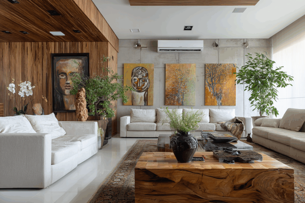 Designers também controlam brilho, sombras e reflexos para que a arte nunca ofusque a leitura do cômodo. Esse controle mantém o tipo de quadro que faz sua sala parecer mais ampla e iluminada e ajuda a descansar os olhos. A iluminação vira aliada. O conforto guia a estética.