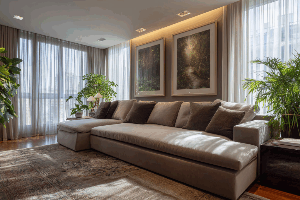 Projetos que repetem tons claros entre quadro, sofá e cortina ampliam a área percebida, reforçando o tipo de quadro que faz sua sala parecer mais ampla e iluminada. Colocar a obra central alinhada ao eixo do sofá organiza o campo visual. A simetria mínima ajuda o relaxamento. O ambiente fica equilibrado.
