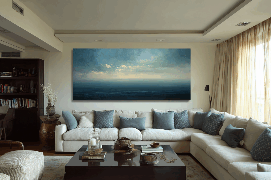Paisagens abertas, céu, mar e caminhos com ponto de fuga favorecem o tipo de quadro que faz sua sala parecer mais ampla e iluminada. Abstrações claras e suaves também funcionam. Prefira baixa saturação e luz difusa na imagem.