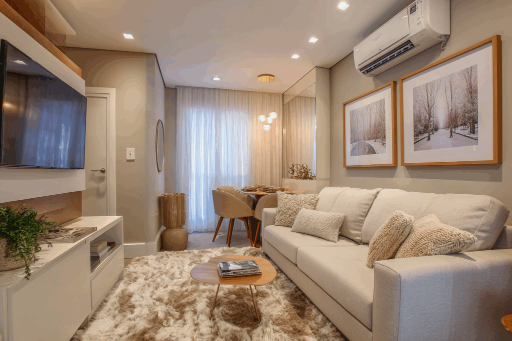 Salas com piso claro e tapete neutro se beneficiam de arte em escala média, evitando extremos. Esse cuidado preserva o tipo de quadro que faz sua sala parecer mais ampla e iluminada e mantém a proporção com o mobiliário. A sensação é de unidade. Tudo conversa entre si.