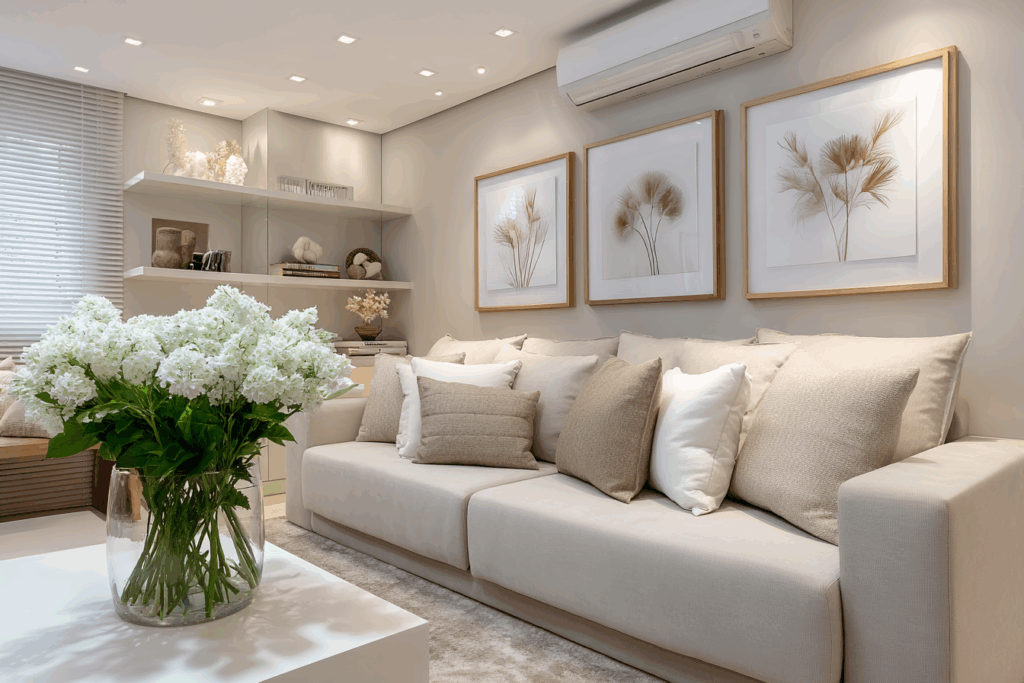Também é possível mesclar claros com pequenos acentos terrosos ou azul acinzentado, sempre em baixa saturação. Essa escolha sustenta o tipo de quadro que faz sua sala parecer mais ampla e iluminada ao mesmo tempo em que adiciona interesse. O segredo é manter o protagonismo da luminosidade. Quanto mais a superfície refletir luz, maior a sensação de respiro.