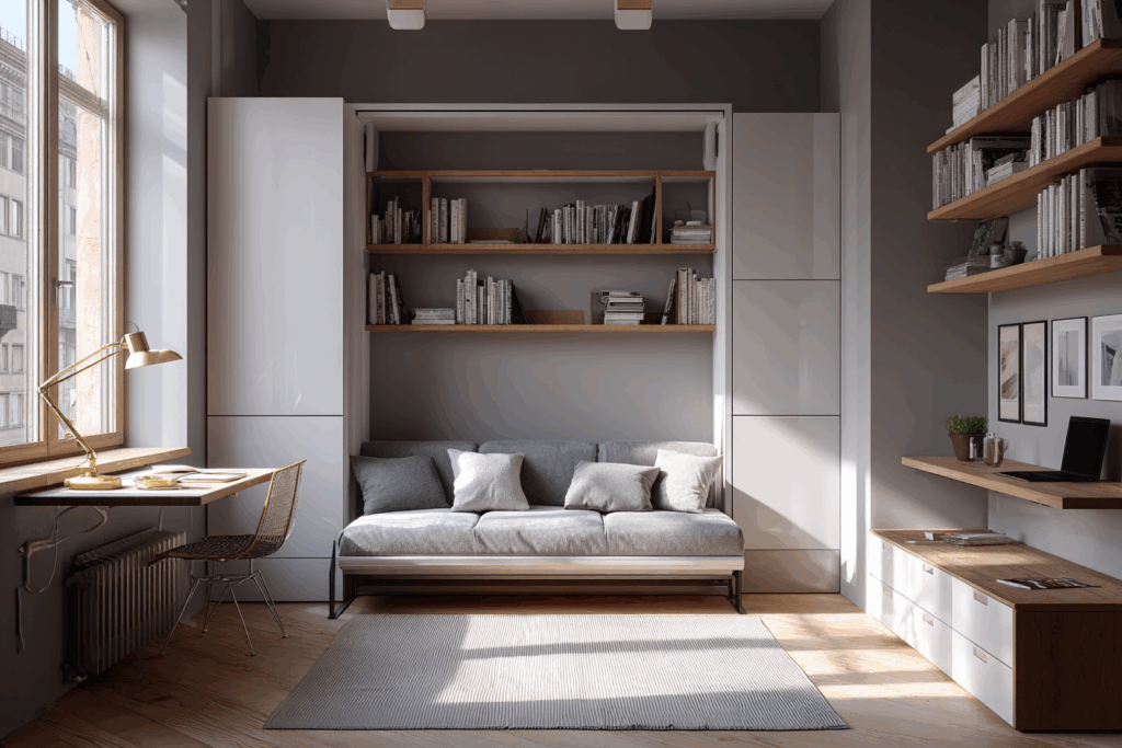 Optando por móveis multifuncionais, cores claras e boa iluminação, o que amplia a sensação de espaço.